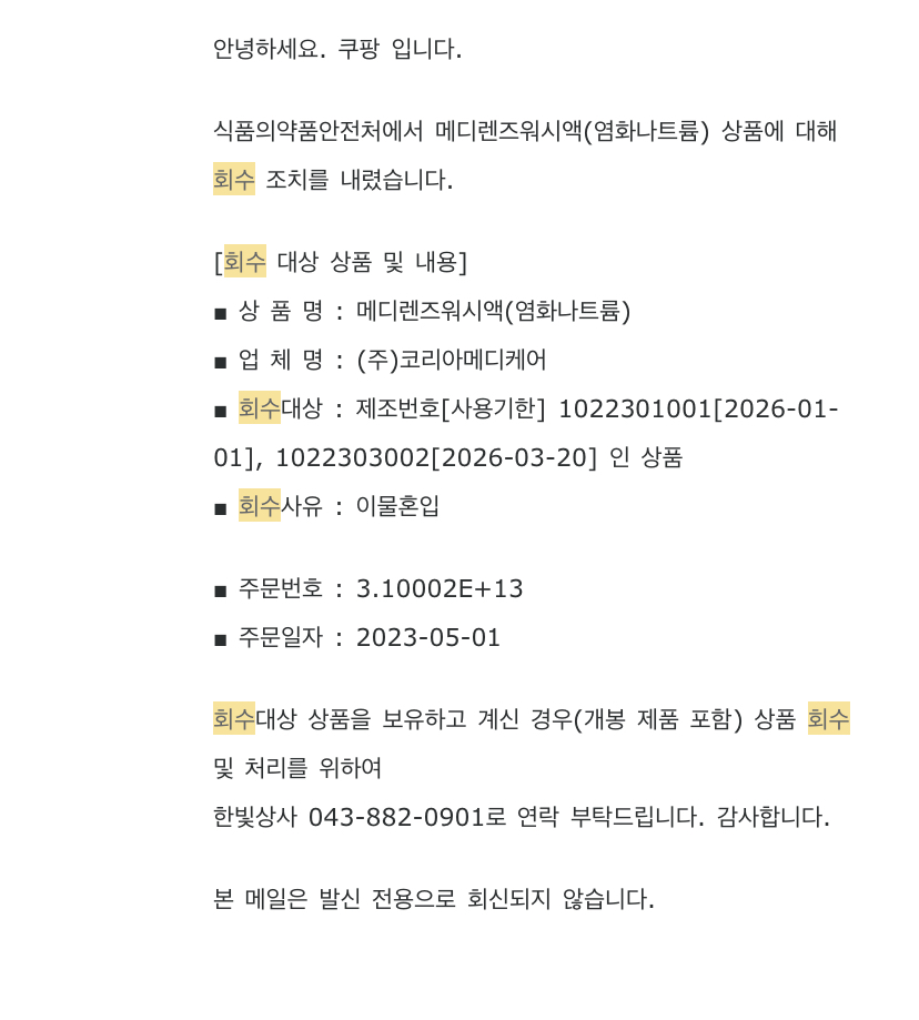 몇 달 전, 드림렌즈 워시액으로 사용하고 있는 '메디렌즈 워시액(염화나트륨)' 리콜 안내를 받았습니다.