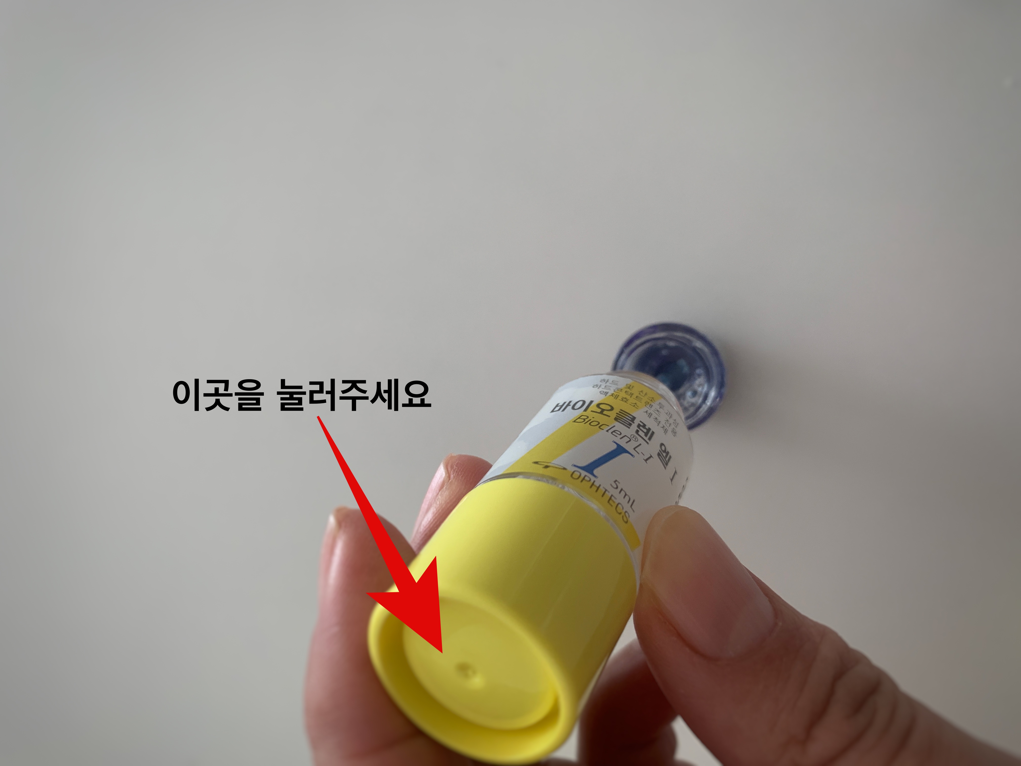 렌즈가 담긴 렌즈용기에 바이오클렌 9를 채워주셨다면, 그다음엔 바이오클렌 1을 한두 방울 떨어뜨려줍니다.
