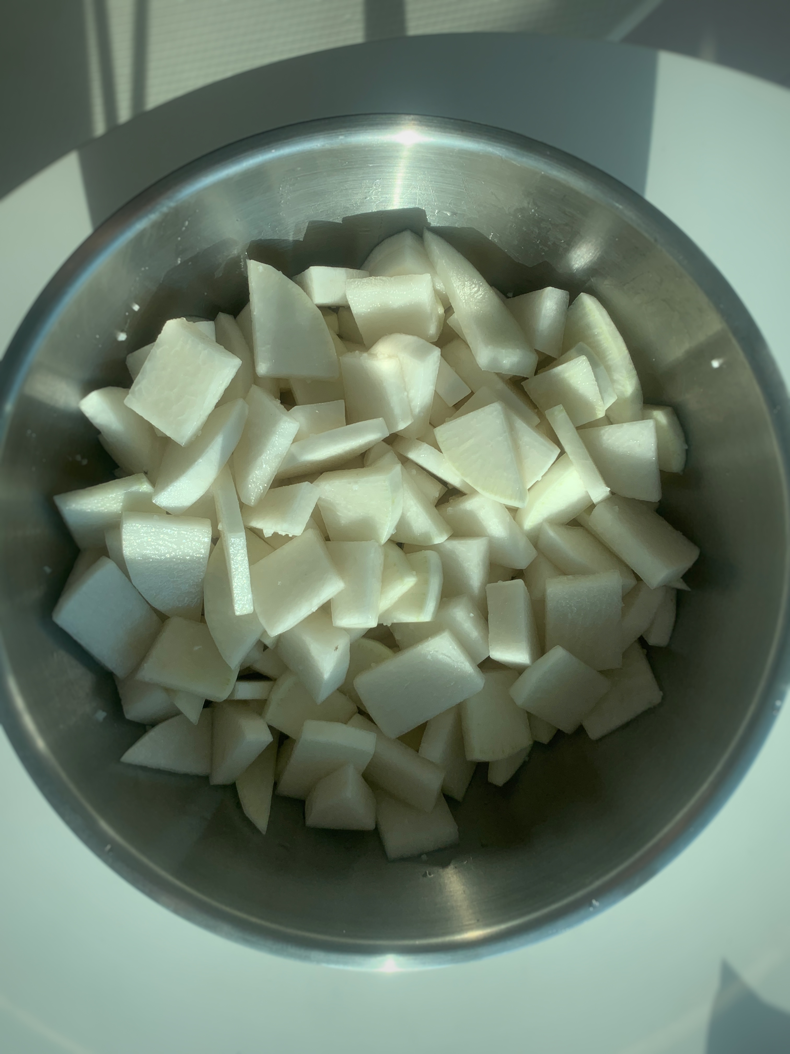 1.2킬로짜리 무 (자기 스타일 대로 잘라 설탕 2T, 꽃소금 2T 뿌려서 2시간 정도 절여줍니다)