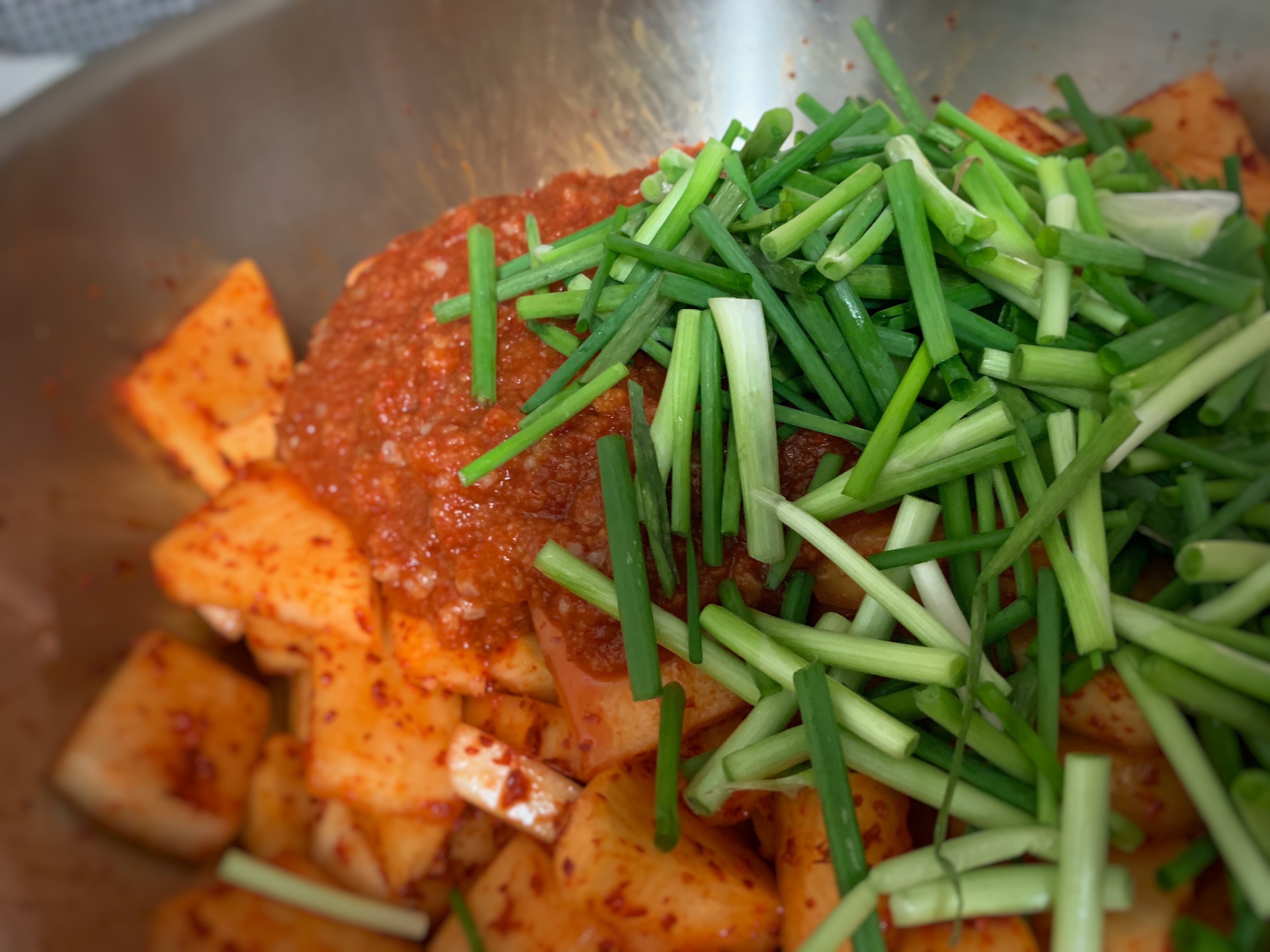 그 후, 믹서기로 간 양념들과 쪽파를 넣고 버무려 주세요.