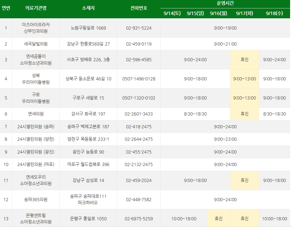 아래 표는, 추석 연휴기간동안 문 여는 아동 병원 연락처와 현황입니다.