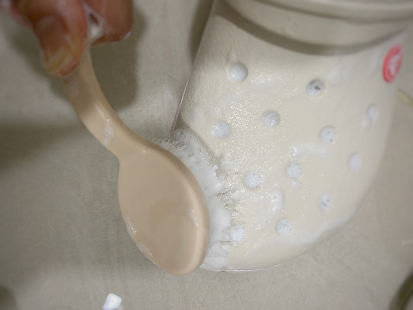 잘 닦아지지 않는 부분은, 빨랫비누로 골고루 비누칠을 해준 뒤 5분 정도 방치해 둡니다.