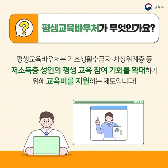 평생교육바우처는 기초생활수급자와 차상위계층 등 저소득층 성인의 평생교육과 참여 기회를
