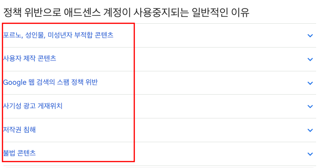 다음은, 구글 '정책센터'에서 공지한 애드센스 계정이 사용중지되는 사유입니다.