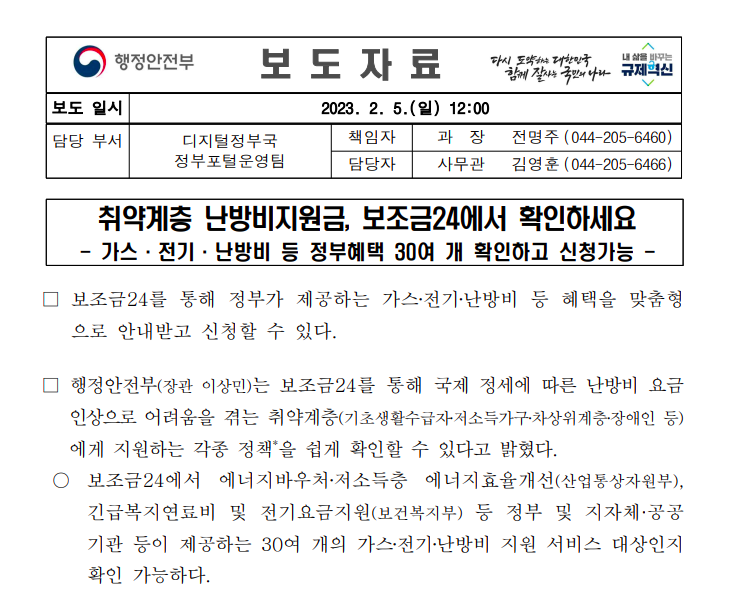 보도자료에 따르면, 보조금 24를 통해 난방비 요금 인상으로 어려움을 겪는 취약계층에게