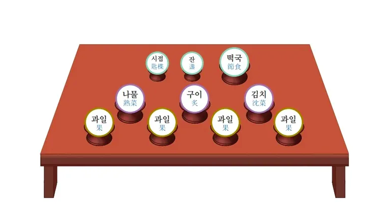 송편이 떡국으로 바뀐것을 제외하면 추석 차례상 예시와 같습니다.