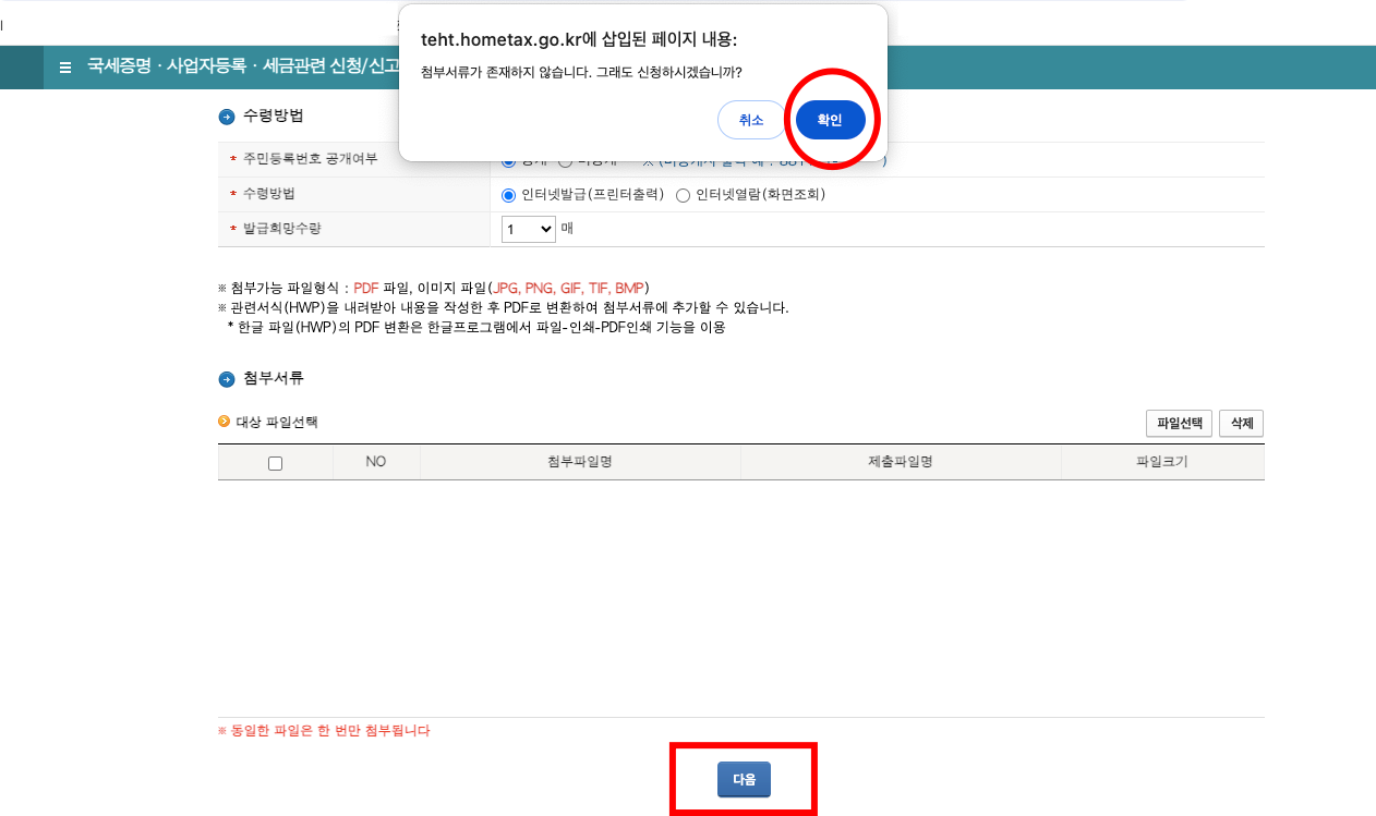 화면이 뜨면, 첨부서류 없이 다음으로 진행하시면 됩니다.