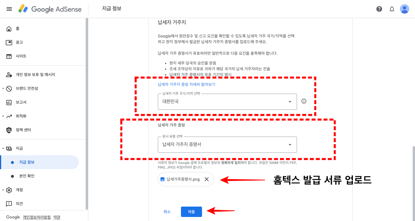 거주자 증명서를 받았기에, 이젠 구글애드센스에 서류를 첨부해 제출해야 합니다.