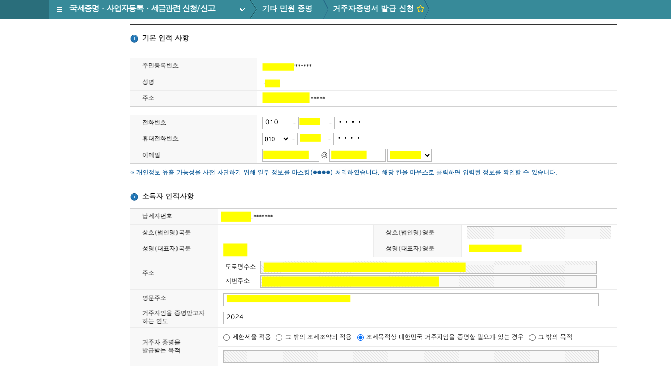 거주자임을 증명하고자 하는 연도는 현재 연도인 '2024년'을 입력했습니다.