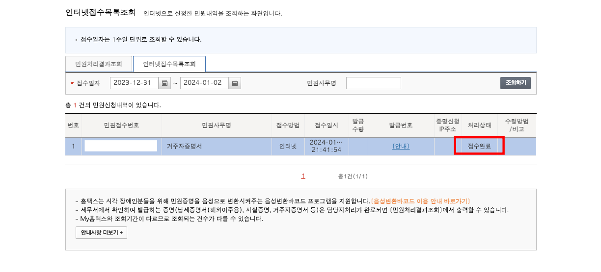 '민원처리결과조회'에 가서 보니, 발급처리가 완료되었네요.