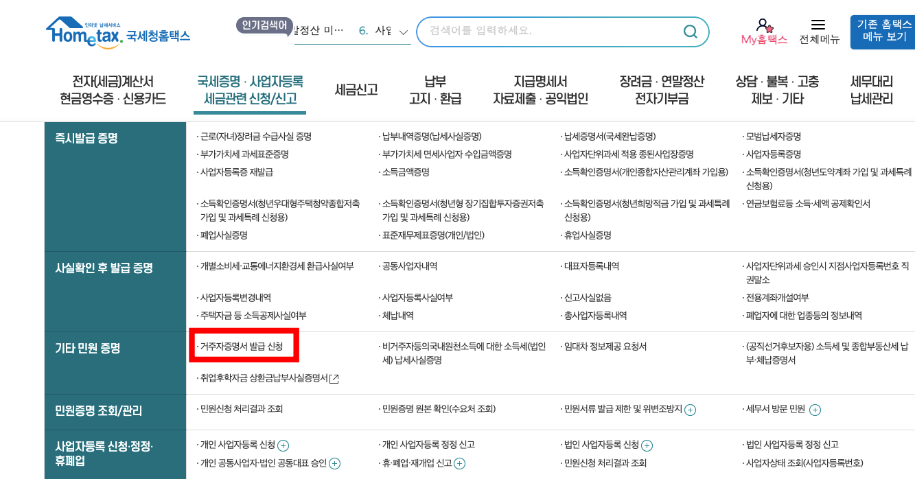 홈텍스 메인화면 빨간 체크박스의 '거주자증명서 발급신청' 표시를 클릭해 주세요.