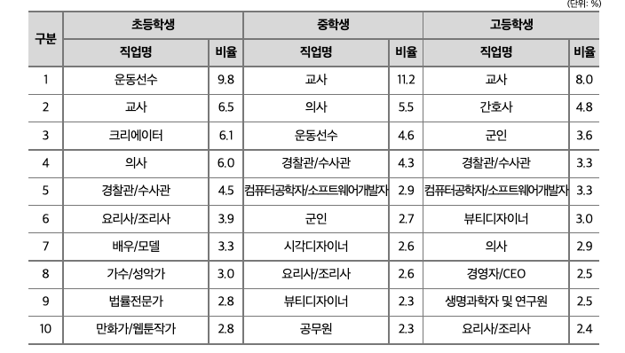 1위 교사, 의사, 운동선수,경찰관 2,3,4위