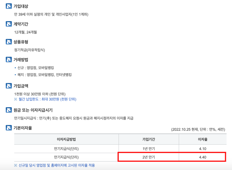월 납입 한도는 30만원 이하, 1인 1 계좌로 39세 이하의 개인고객을 대상으로 영업점 통해 가입 가능합니다.