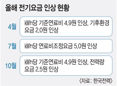10월: kwh당 기준연료비 4.9원 인상, 전력량 요금 2.5원 인상