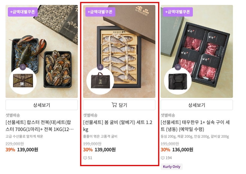 무엇보다 금액별 항목별 정리가 아주 잘되어 있고요. 컬리에서만 구입 가능한 항목도 많아 차별화에 성공한 것 같습니다.